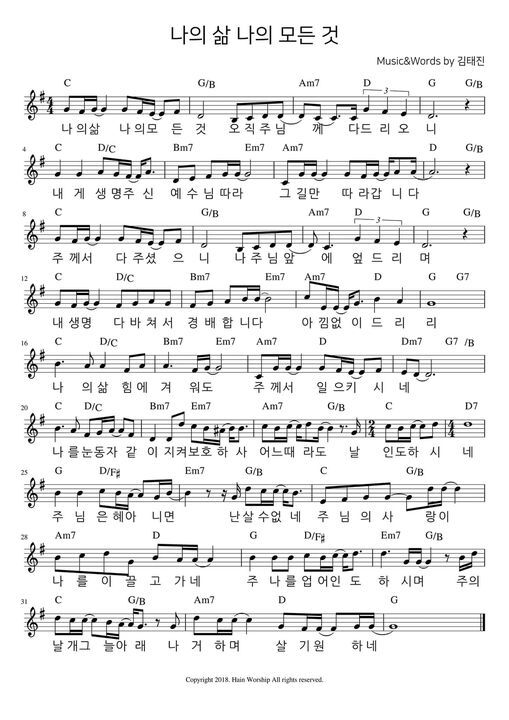 나의 삶 나의 모든 것 - 악보, 가사, 영상 C KEY