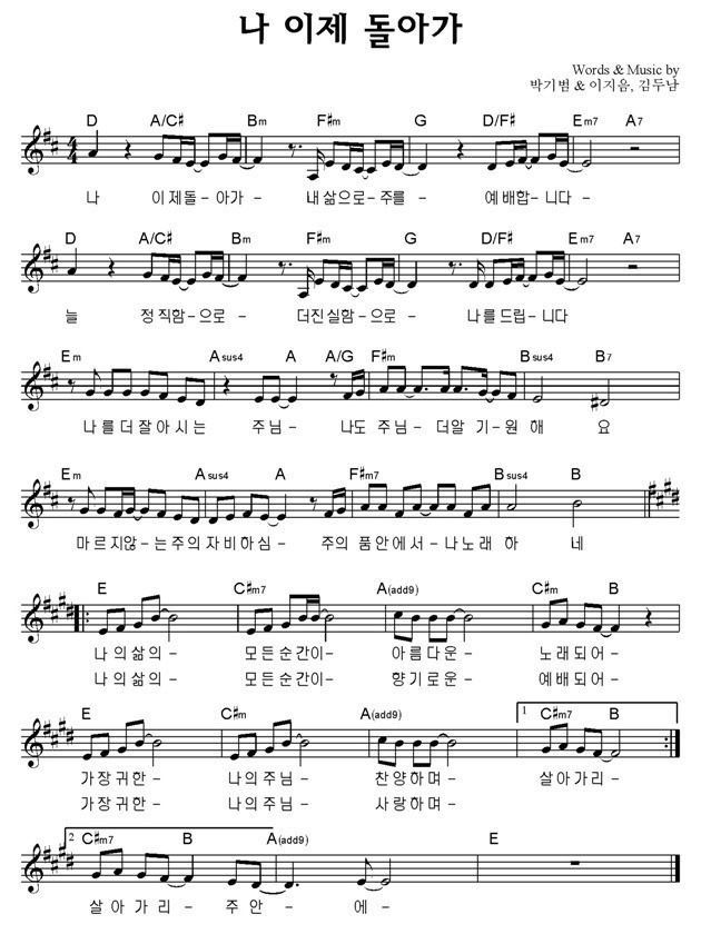 나 이제 돌아가 - 악보,가사,영상 D KEY