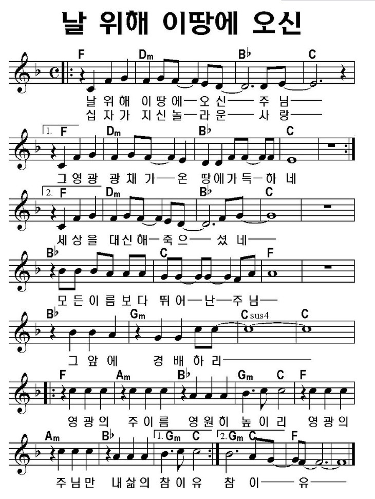 | 나 주님의 기쁨 되기 원하네 (악보/영상/가사) – F코드 예배 찬양 (0) | 2025.07.28 |