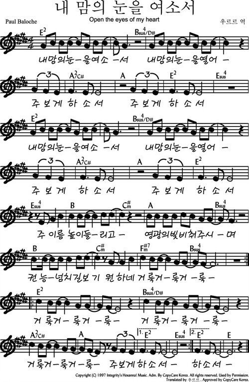 내 맘의 눈을 여소서 (Open The Eyes Of My Heart) - 악보,가사,영상 E KEY