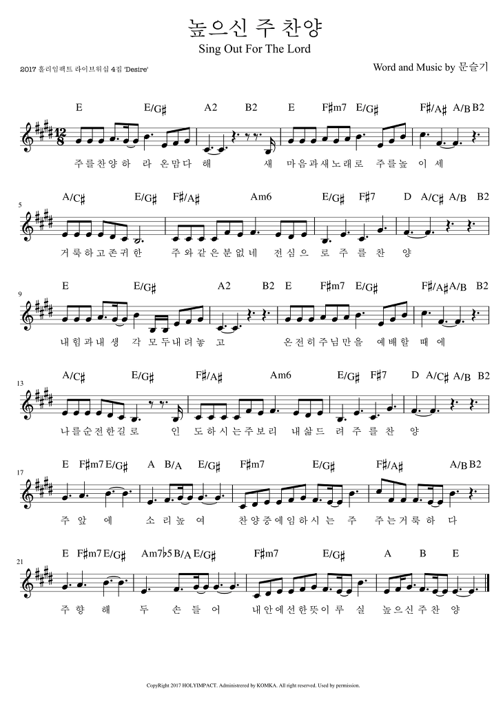 높으신 주 찬양 - 악보,가사,영상 E KEY