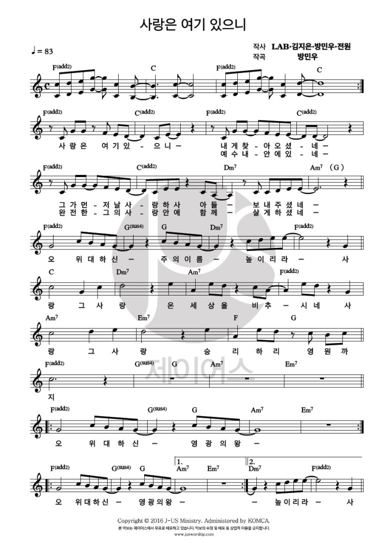 사랑은 여기 있으니 (제이어스) 가사,악보,영상 - C key