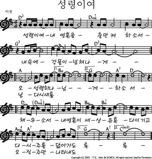 성령이여 내 영혼을 - 악보,가사,영상 D KEY