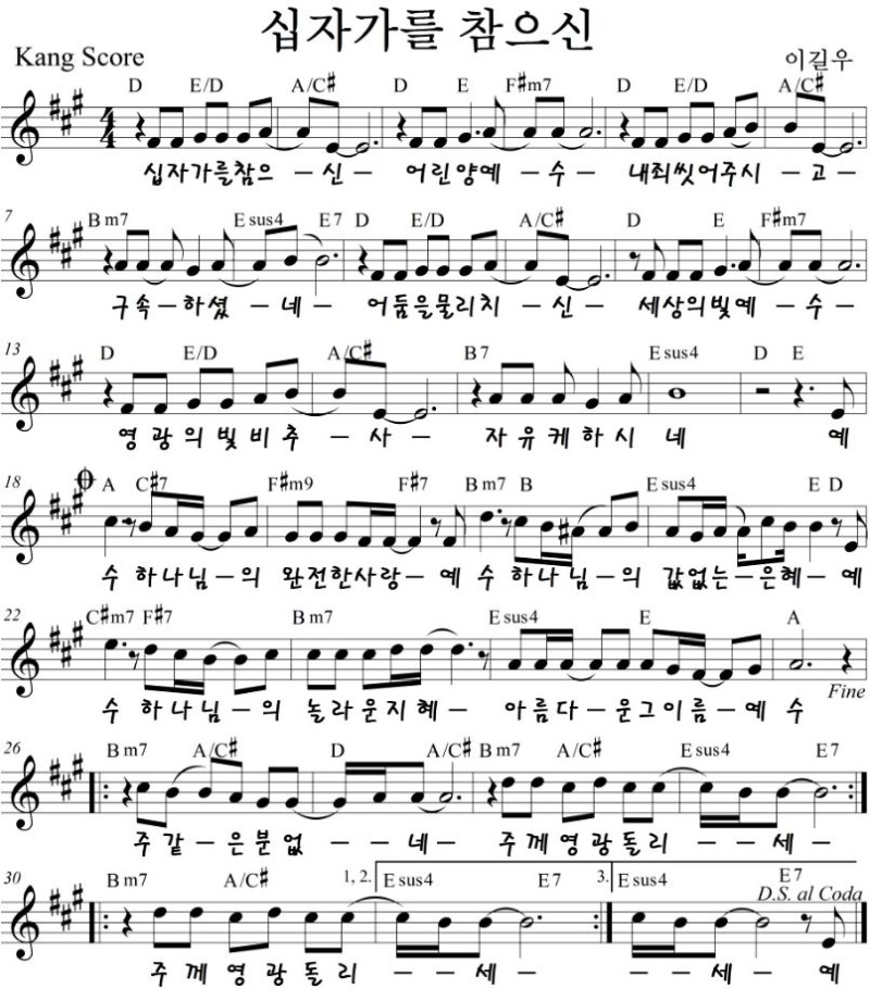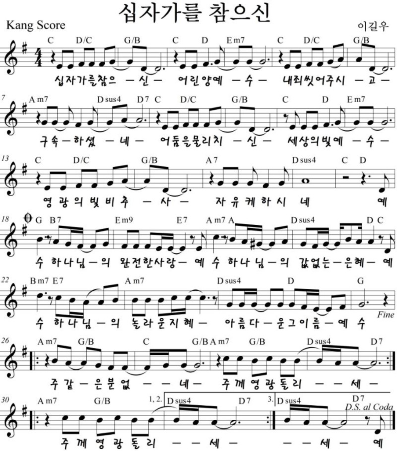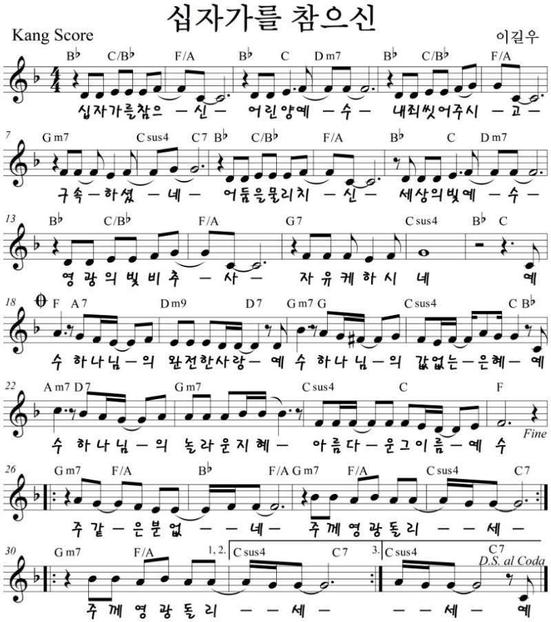 십자가를 참으신 - 악보,가사,영상 Bb, C, D KEY