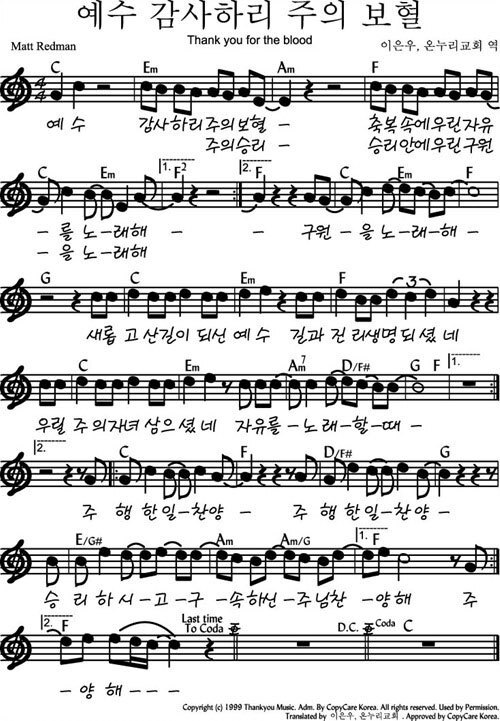 예수 감사하리 주의 보혈 (Thank you for the blood)- 악보,가사,영상 C KEY