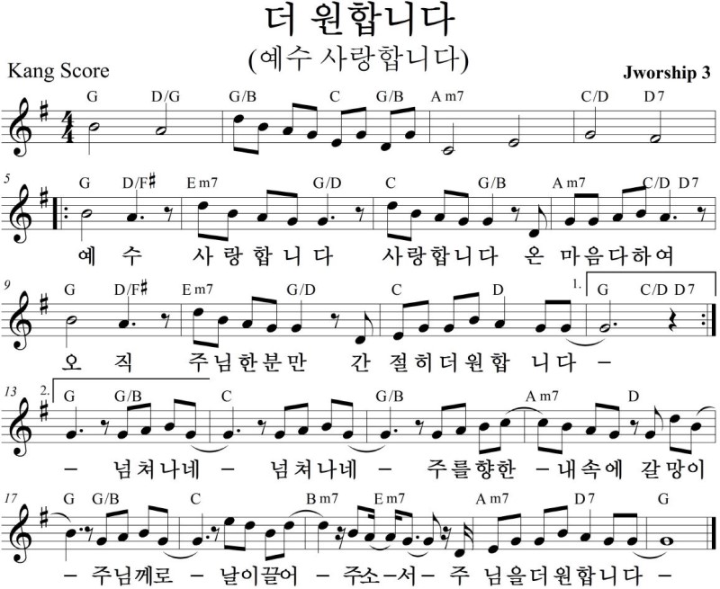 예수 사랑합니다(더 원합니다) - 악보,가사,영상 D, E, F ,G KEY