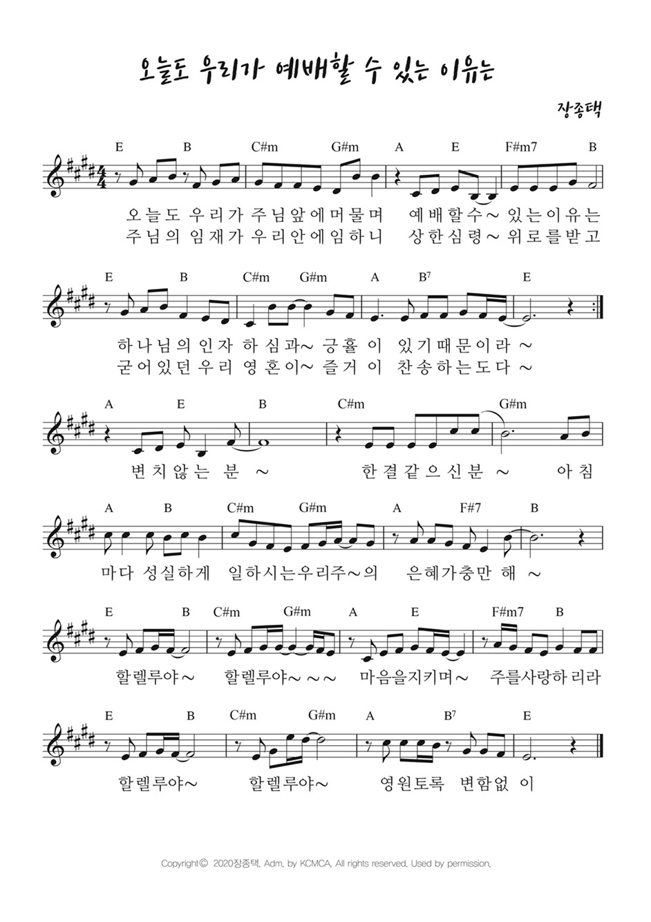 오늘도우리가예배할수있는이유는 가사,악보,영상 - 장종택 E key