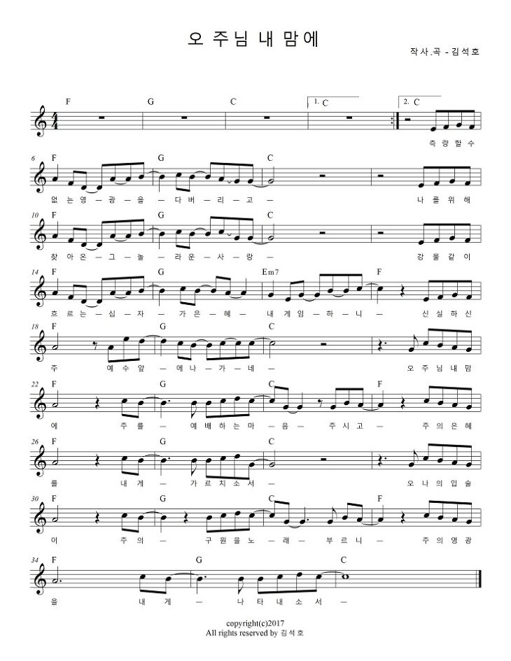 오 주님 내 맘에 - 악보, 가사, 영상 C KEY