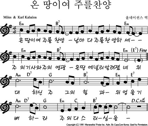 온 땅이여 주를 찬양 - 악보,가사,영상 E KEY