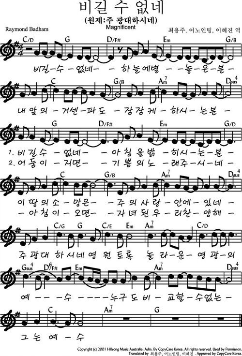 주광대하시네(비길수없네, Magnificent) - 악보 ,영상 ,가사 C KEY