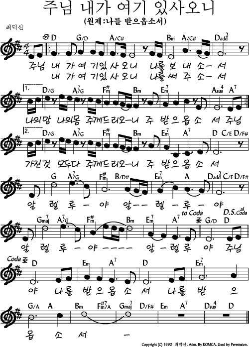주님 내가 여기 있사오니 - 악보,가사,영상 D KEY