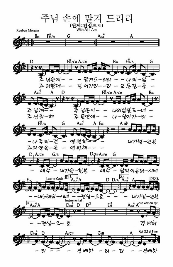 주님 손에 맡겨드리리 - 악보,가사,영상 D KEY