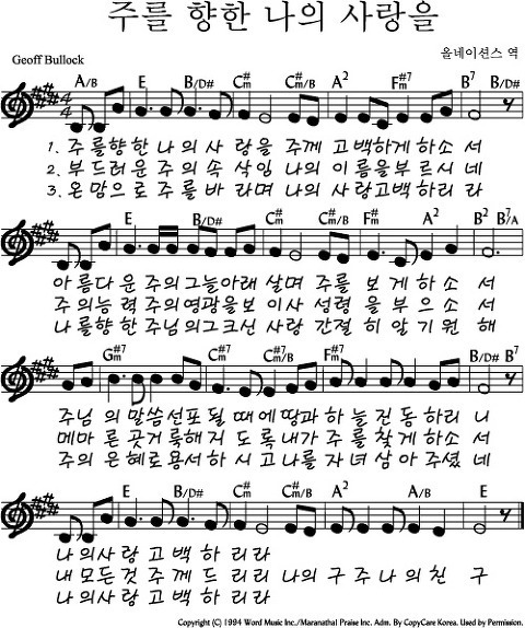 주를 향한 나의 사랑을 - 악보,가사,영상 E KEY