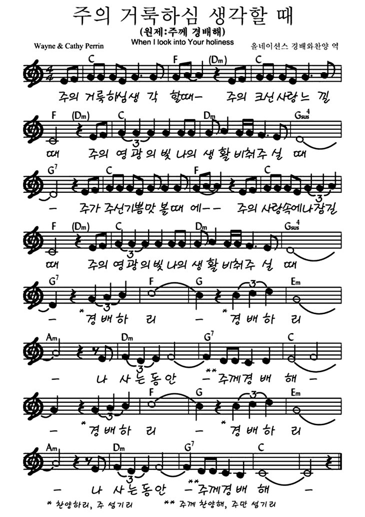 주의 거룩하심 생각할 때 - 악보, 가사, 영상 C KEY