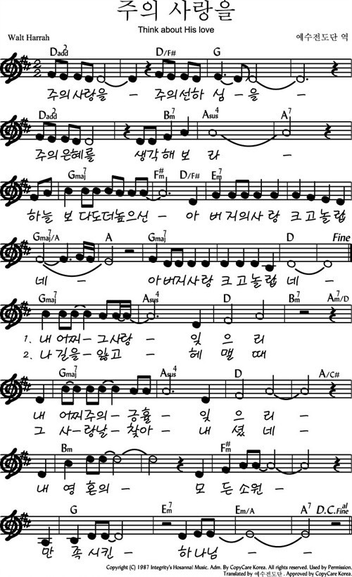 주의 사랑을 주의 선하심을 - 악보,가사,영상 D KEY