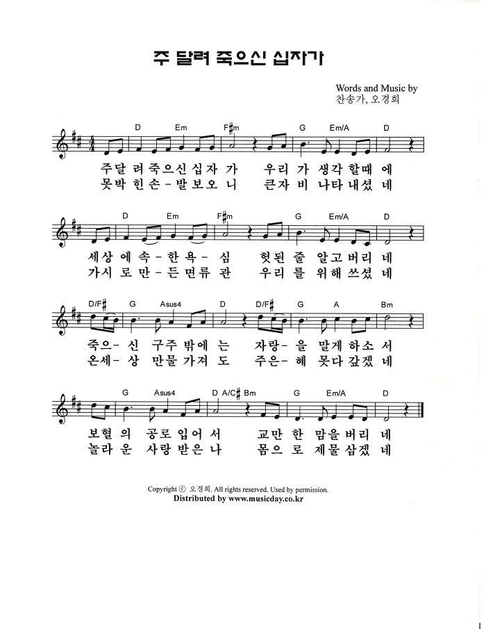 주 달려 죽으신 십자가 - 악보,가사,영상 D KEY