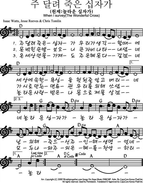 주 달려 죽은 십자가 - 악보,가사,영상 D KEY