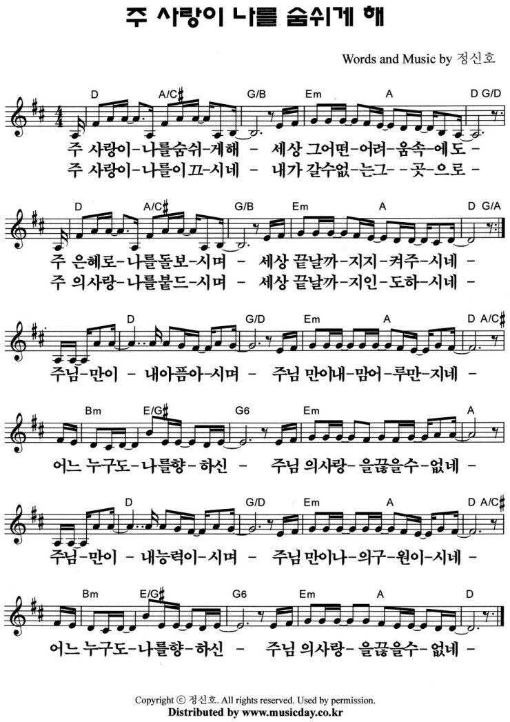 주 사랑이 나를 숨쉬게 해 - 악보,가사,영상 D KEY