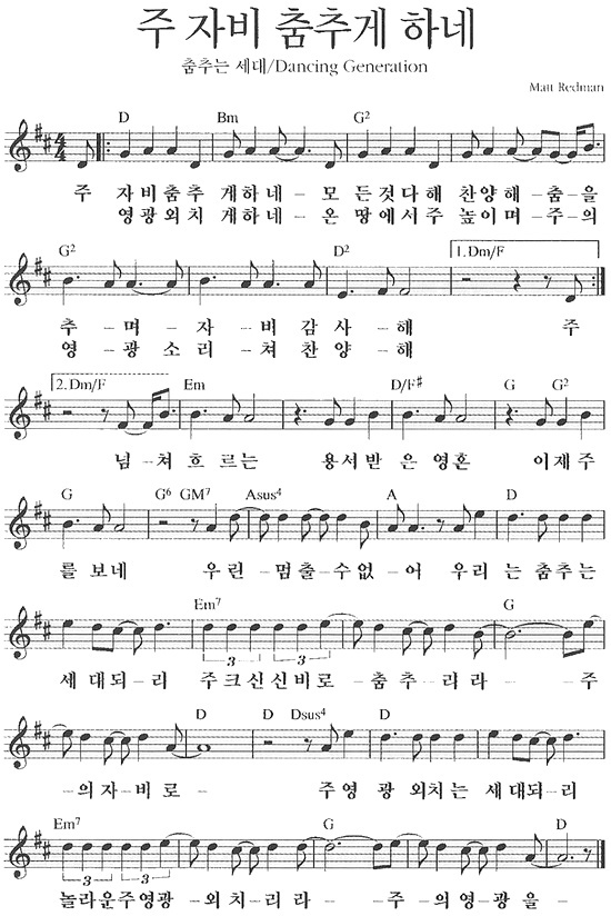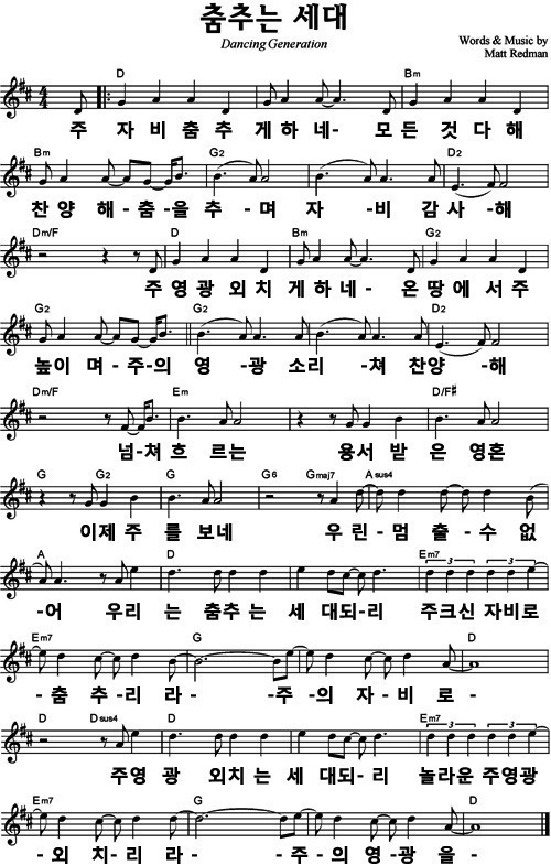 춤추는 세대(주 자비 춤추게하네) - 악보,가사,영상 D KEY