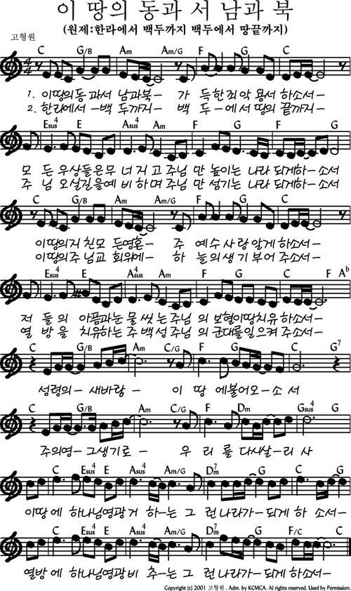 한라에서 백두까지 백두에서 땅끝까지(이땅의동과서남과북) - 악보,가사,영상 C KEY