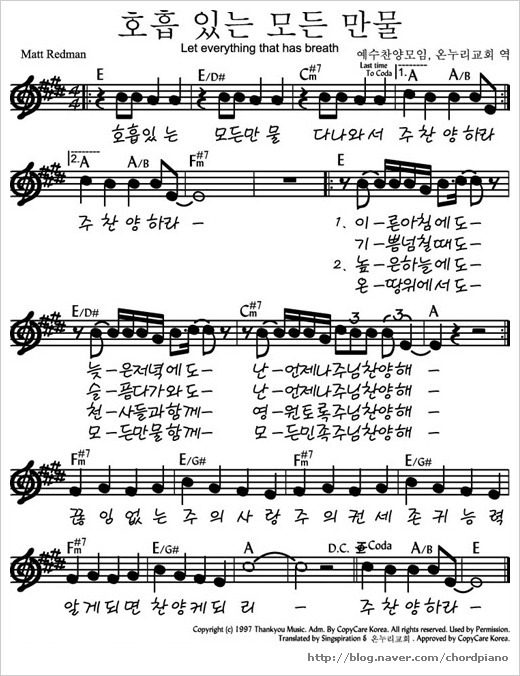 호흡 있는 모든 만물 - 악보,가사,영상 E KEY