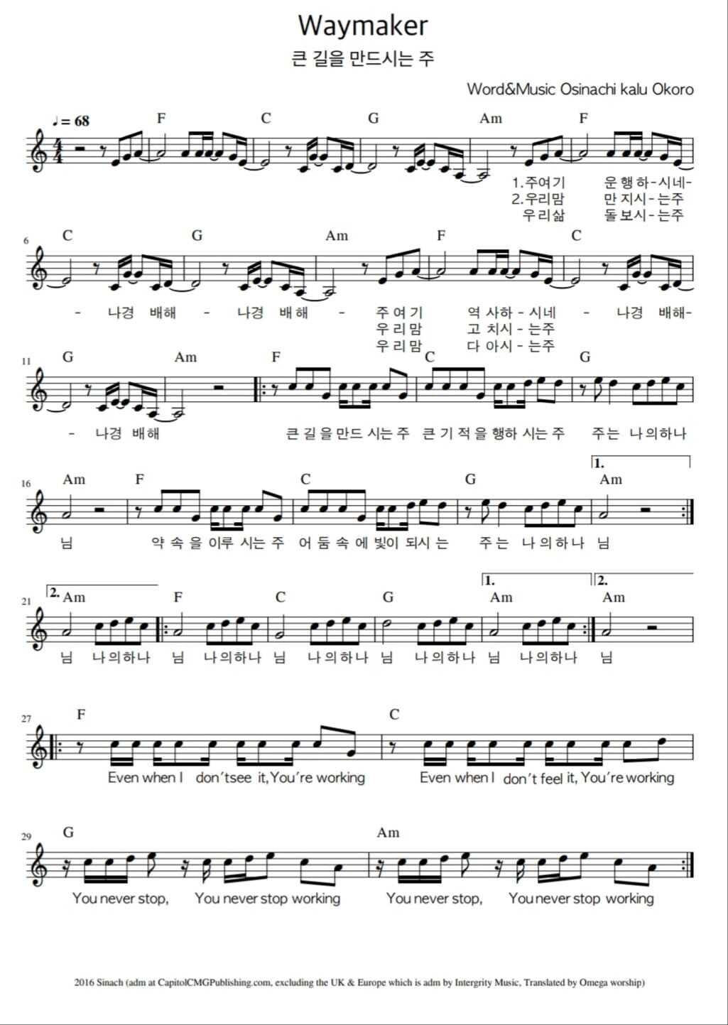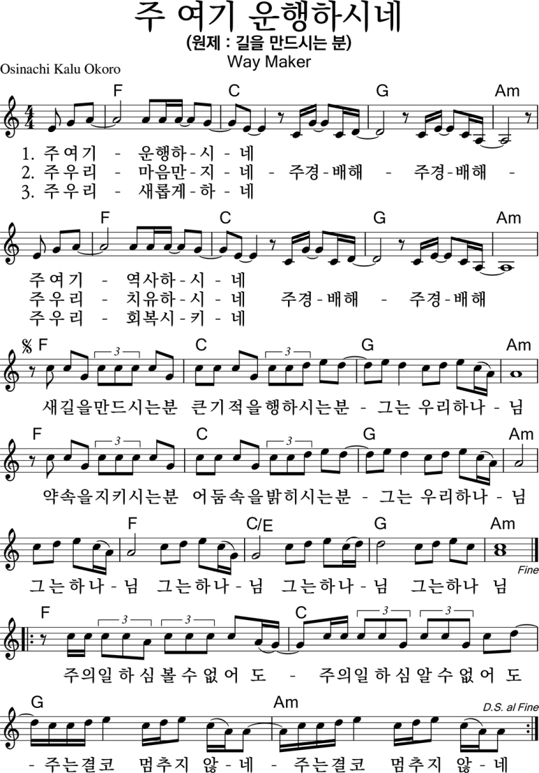 Way Maker (큰 길을 만드시는 분)-악보 ,가사 ,영상 A KEY